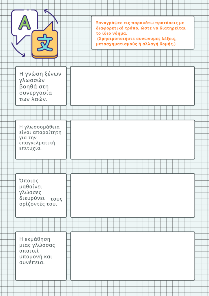 Ασκήσεις στους τρόπους ανάπτυξης Πρώιμη Παρέμβαση ΑρθρογραφίαΥλικό Δημοτικό ΑρθρογραφίαΥλικό Γυμνάσιο ΑρθρογραφίαΥλικό Λύκειο ΑρθρογραφίαΥλικό Ασκήσεις για τη γλωσσομάθειαΑσκήσεις για τη γλωσσομάθεια